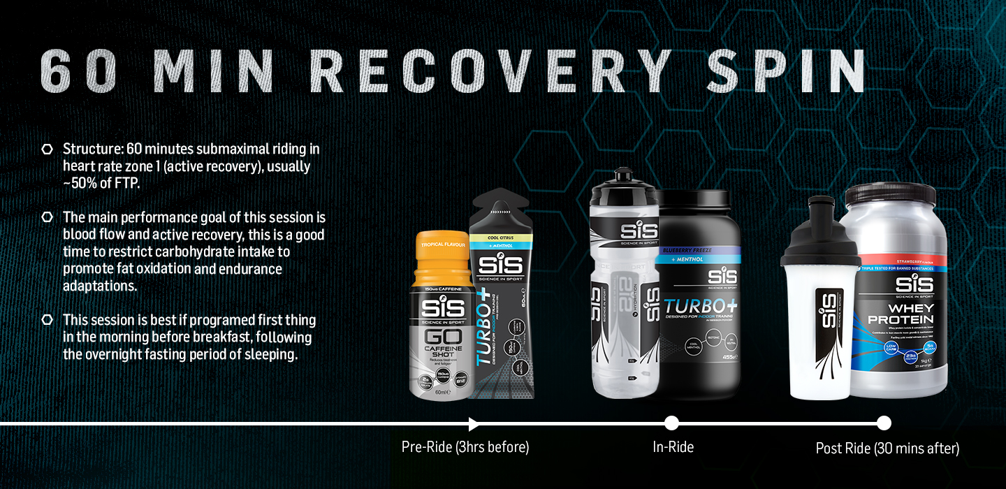 As the main performance goal of this session is blood flow and active recovery, this is a good time to restrict carbohydrate intake to promote fat oxidation and endurance adaptations. This session is best if programmed first thing in the morning before breakfast, following the overnight fasting period of sleeping. Caffeine can be used pre-ride to support performance while still maintaining the desired training adaptations.