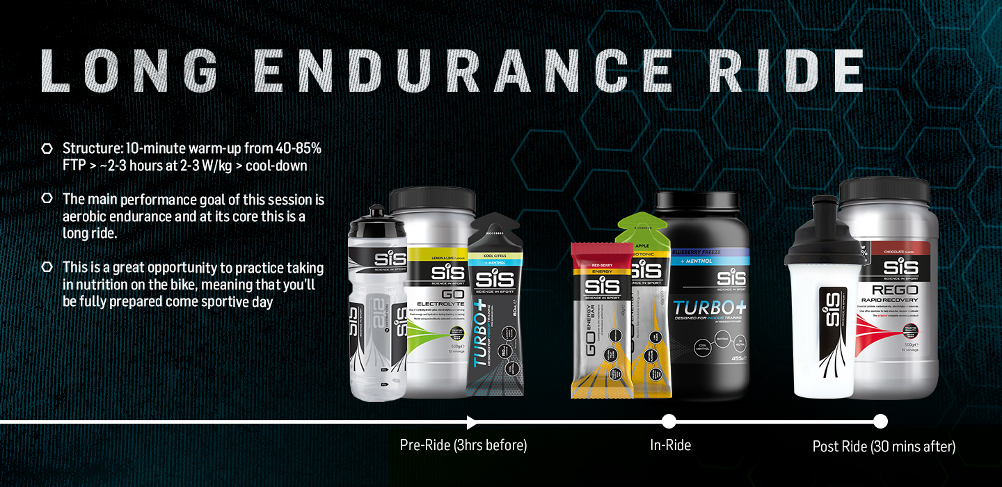 As the main performance goal of this session is aerobic endurance and at its core this is a long ride, fuelling through the session will be key. This also acts as great opportunity to practice taking in nutrition on the bike, meaning that you’ll be fully prepared come sportive day.