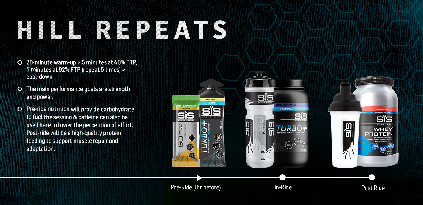 As the main performance goals are strength and power, pre-ride nutrition will provide carbohydrate to fuel the session, caffeine can also be used here to lower the perception of effort, meaning you can push harder during the 5-minute intervals. Post-ride will be a high-quality protein feeding to support muscle repair and adaptation.