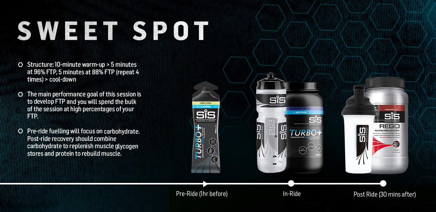Training at sweet-sport is a time-efficient method to improve functional threshold power, as you can spend quite a bit of time in the sweet-spot of your power curve without building up excess training stress. Programme this session multiple times in your training week and watch that FTP rise.