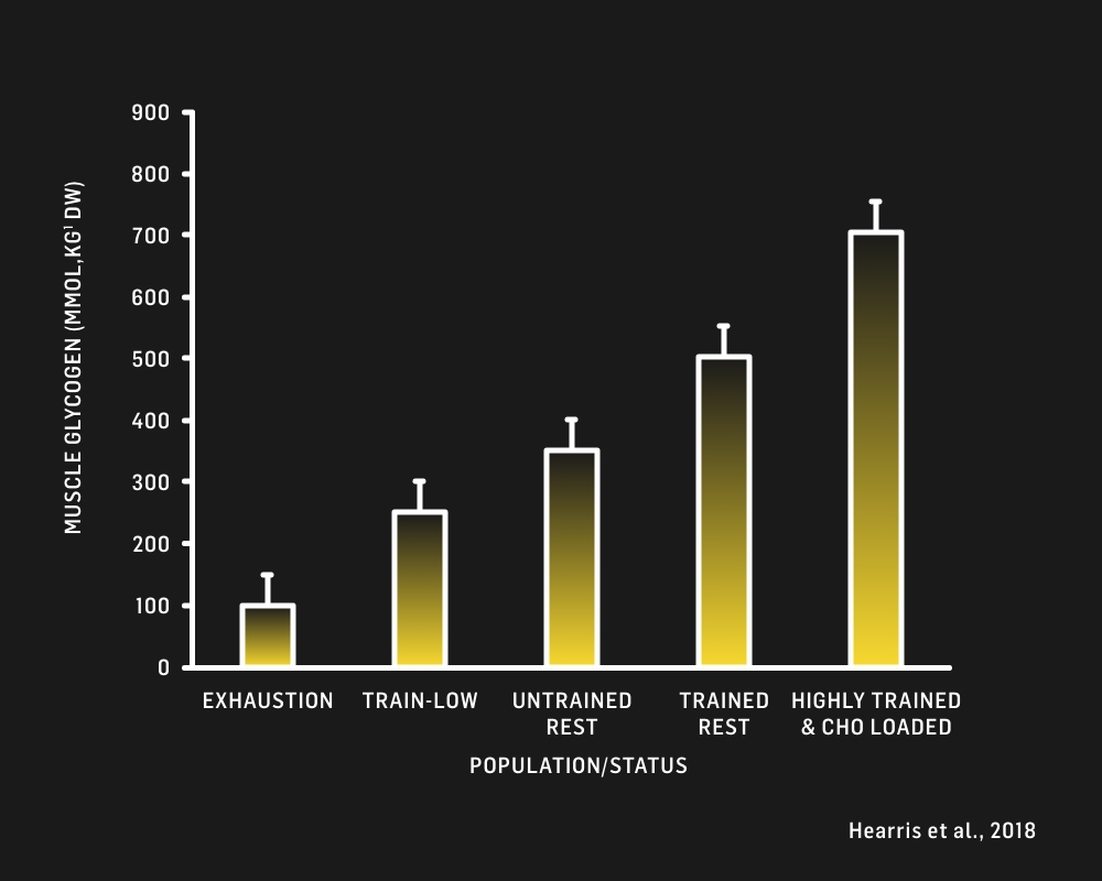 Variations in muscle glycogen storage according to fatigue status, training status and dietary carbohydrate (CHO) intake.