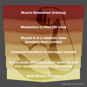 During the actual training session itself, MPB increases and subsequent muscle damage occurs. If we did not consume any nutrients (especially protein) in the recovery period, then net muscle protein balance would become negative. This is often referred to as being in a “catabolic state”. In order to induce a positive net protein balance and provide the conditions to grow muscle, it is crucial to ingest protein within 30 minutes of finishing your training. In this way, amino acids are delivered to the muscle thereby providing the building blocks to help our muscles rebuild, grow and recover. At this time, muscle is said to be in an “anabolic state”. With the correct training and nutrition plan, MPS will exceed MPB and hence muscles accrue protein so that they get bigger and stronger. In termsterms of protein feeding, feeding protein that contains the amino acid leucine is especially important(5). Leucine acts as a trigger to instruct our muscles to actually begin the anabolic process. We then need the additional essential amino acids to subsequently provide the building blocks of new muscle protein to be made(6).