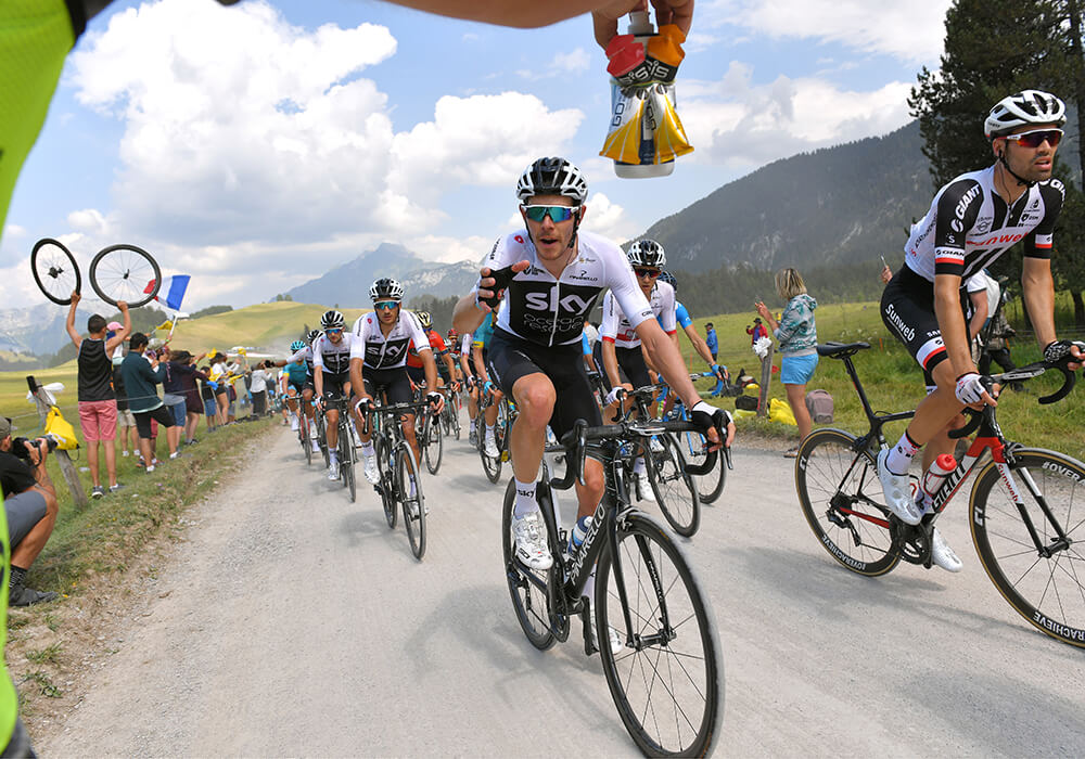 天空车队的快餐。卢克-罗(Luke Rowe)在第 10 赛段中抓起两个 GO Isotonic 能量胶和一个水瓶。